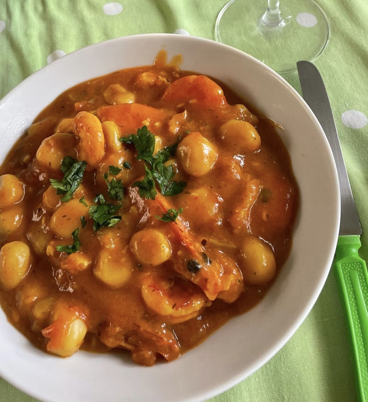 5 minutes avant la fin de la cuisson, retirez le piment si vous craignez le piquant trop fort, puis ajoutez les crevettes marinées dans la cocotte. Mélangez doucement. Les crevettes cuisent très vite ; dès qu’elles deviennent roses / orange, c’est prêt !