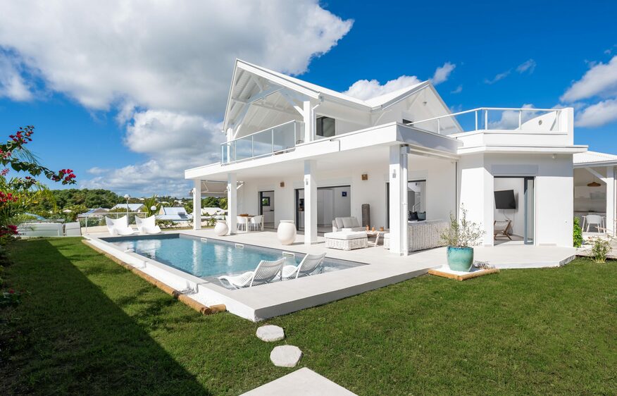 Nichée dans les hauteurs de Saint-François, cette propriété d’exception de 175 m² séduit par son architecture résolument moderne et ses lignes épurées. Conçue pour offrir une expérience de séjour exclusive, elle dispose de quatre suites spacieuses avec salles d’eau privatives, garantissant une intimité totale pour huit convives.