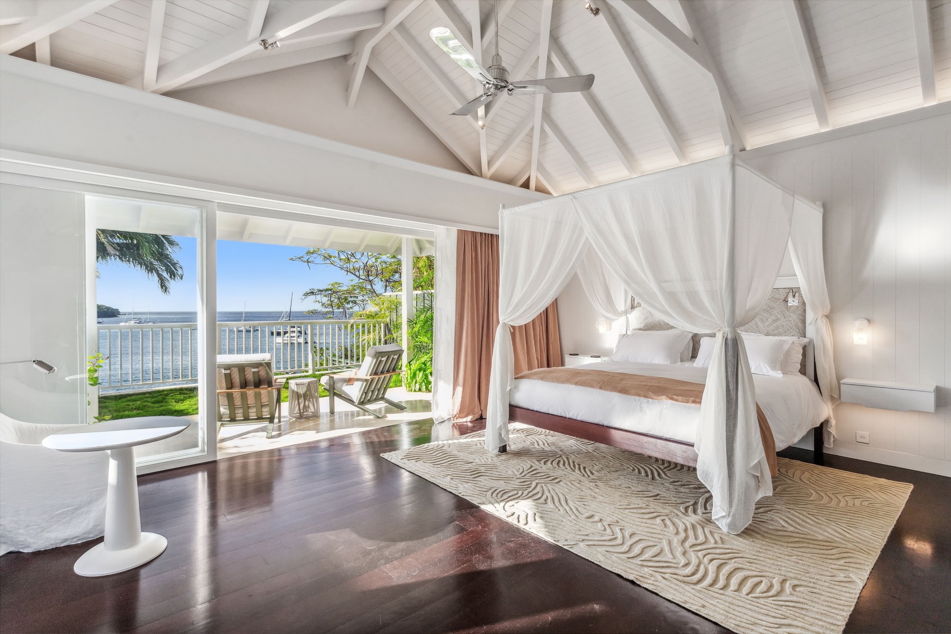 Les intérieurs, baignés d’une lumière pure, offrent des volumes aérés et épurés. Les codes des maisons créoles traditionnels y sont réinterprétés avec finesse. Les espaces respirent, s’ouvrent sur l’extérieur et cultivent une élégance discrète, jamais ostentatoire. Les influences caribéennes s’y mêlent à une touche de « tropicalisme » raffiné, rappelant l’esthétique des grandes demeures anglo-saxonnes des îles.