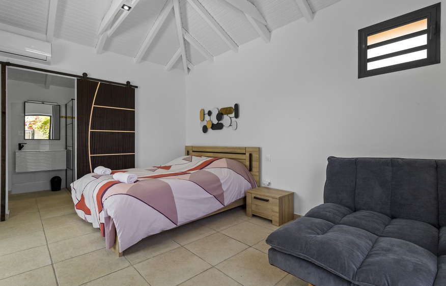 Upon entering, a leafy driveway leads you to the bungalow's main door, where a calm, soothing atmosphere awaits you. Inside, the air-conditioned master bedroom is distinguished by its comfort, with a queen-size bed (160x200 cm), as well as a convertible sofa, offering the possibility of accommodating an extra person if required. Furnishings include a chest of drawers and a connected flat-screen TV with access to Netflix and Prime Video with your own codes .