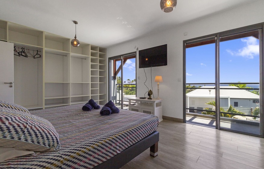 The property manager was on site to welcome us with fresh fruit and water. The home was very clean and the pictures are accurate of the property. The yard is beautiful and there is plenty of seating and shade, a sparkling clean salt water pool and nice views. The main level has two bedrooms, one bath and a nice open kitchen. The kitchen has everything you need - toaster, blender, coffee machine, etc. Laundry is also on the main floor. Upstairs is the master quite with king size bed and another full bathroom. The views are beautiful! Air conditioning is available in all the rooms. The showers had nice pressure and the water was warm. The home is located maybe 5 minutes from club med and Sainte Anne Beaches. Overall we had a wonderful stay and would highly recommend this home!