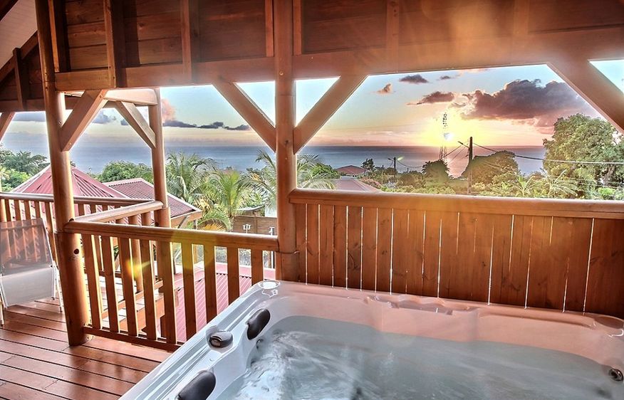 The communal area features a lovely sitting area with carefully selected furniture, and a large, modern, fully-equipped kitchen with dishwasher, washing machine, oven, microwave, kettle, coffee maker, washing machine, plancha (barbecue loan), Senseo, fridge, and each drawer offers a host of kitchen accessories. It's simple: it's all there! From the balcony of the Sunset villa, you can enjoy your private spa while admiring the sunset on the horizon. The view from this villa is unique and breathtaking!
