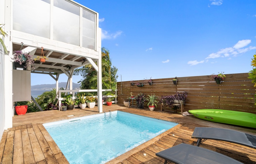 Outside, a large, carefully laid-out terrace invites you to enjoy a breathtaking view over the bay of Fort-de-France. With an outdoor lounge for hours of conversation, deckchairs for sunbathing and a dining table, there's nothing lacking for convivial moments. The private swimming pool (2 m x 3 m), treated with salt, is a real haven of freshness and has an outdoor shower for rinsing off after the beach or before a swim. Water sports enthusiasts will appreciate the kayak, while beach lovers will enjoy the beach chairs and cool box available. The terrace, which opens onto the living area, reinforces the desire to live outside, to make the most of this tropical setting.