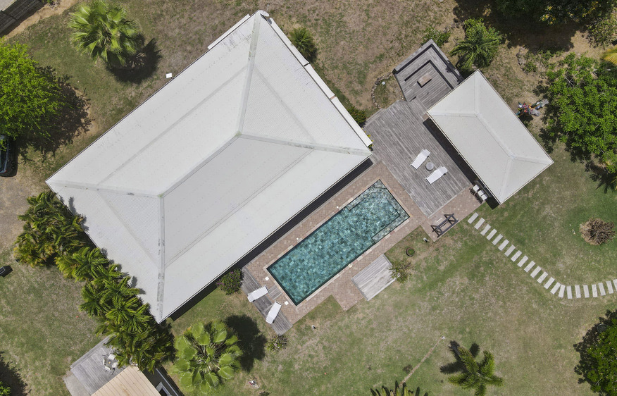 Pour accéder à la terrasse de la villa principale depuis le bungalow, il suffit de traverser un petit morceau de jardin. Vous apprécierez tout particulièrement les espaces extérieurs qui invitent à la détente. Tout a été pensé pour votre confort : une grande piscine au sel, une grande cuisine extérieure, un carbet, des transats…