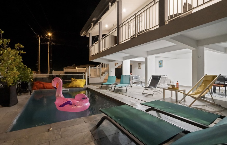 Le rez-de-chaussée abrite un vaste espace extérieur avec une piscine sécurisée de 5m x 3m par une barrière de protection, idéale pour des moments de détente, entourée de ses transats et ses poufs.